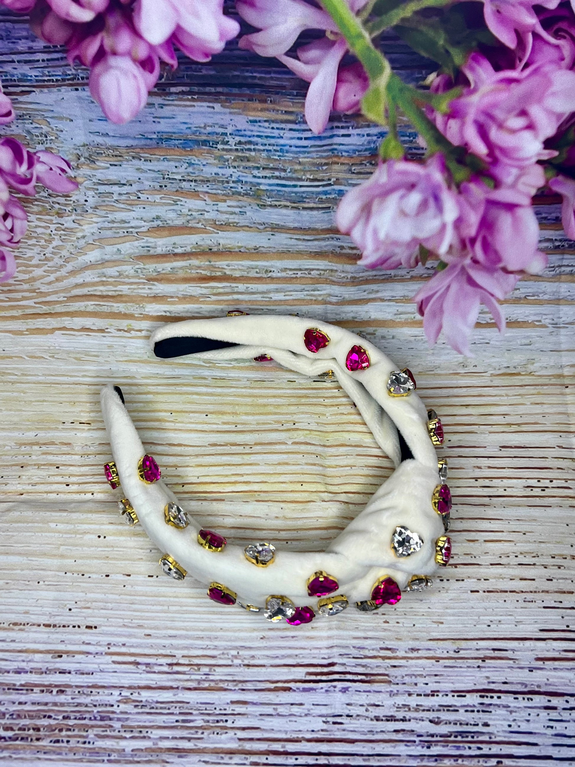 Cream Knotted Valentine’s Headband with Diamanté Hearts